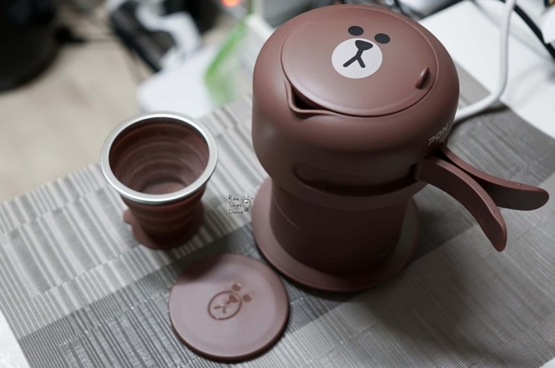 한 손에 잡히는 브라운 접이식 전기포트의 크기는 120 x 75mm 무게 약 800g입니다. 손잡이가 달린 뚜껑에도 귀엽게 브라운이 그려져 있고요.